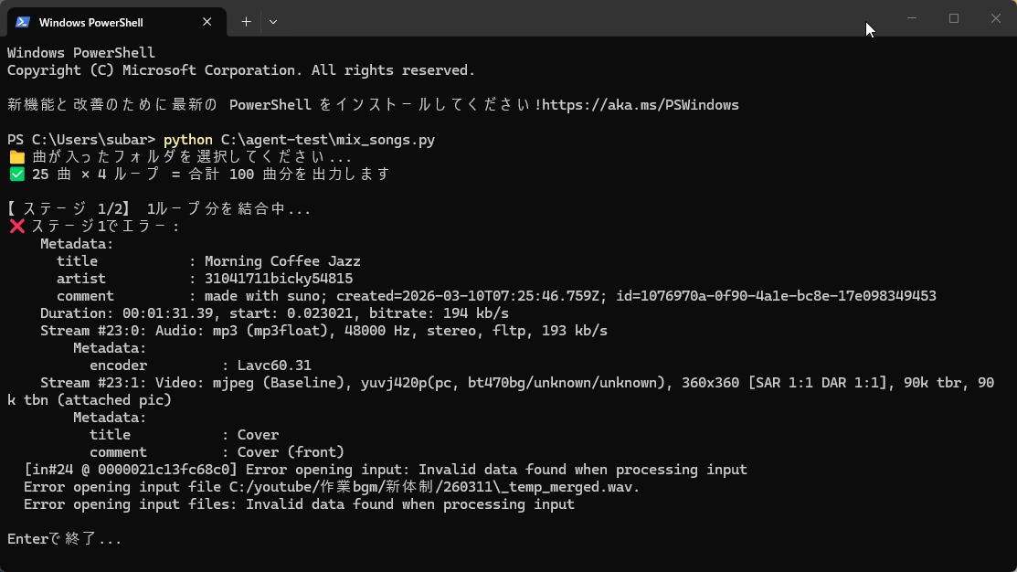 で、実際に「24時間BGMをストリーミング配信するPythonスクリプト(mix_songs_streaming.py)作って」と意気揚々と丸投げしてみたら——見事にパソコンがフリーズして沼にハマりました。