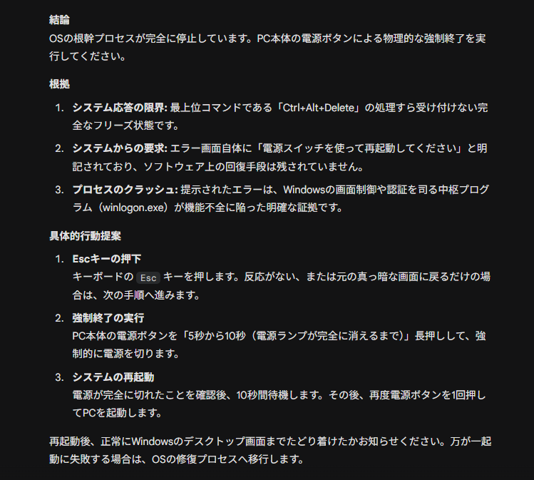 「スクリプトを実行したらPCがフリーズしたから、プログラムを修正して」と正直に状況を伝えて丸投げし返す。